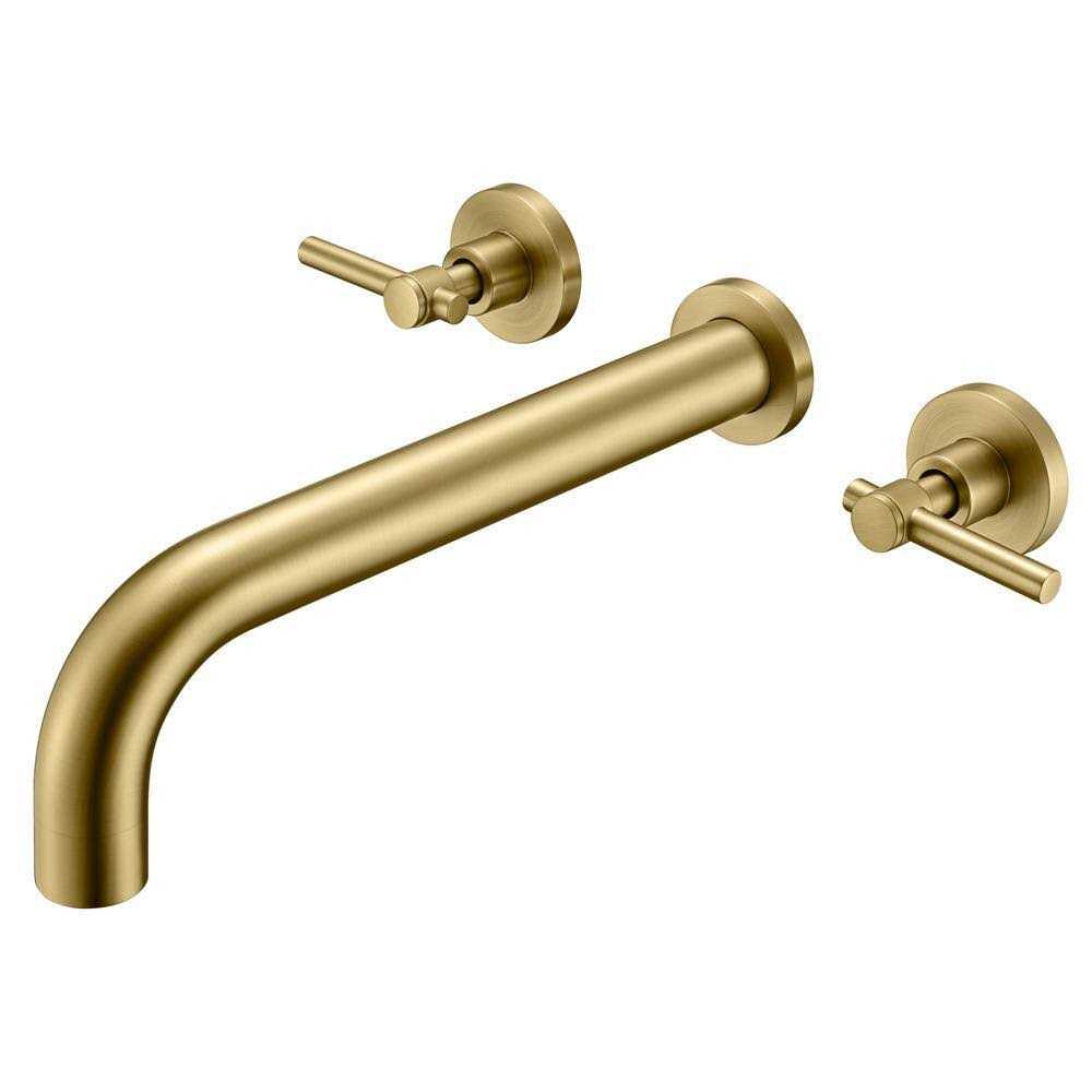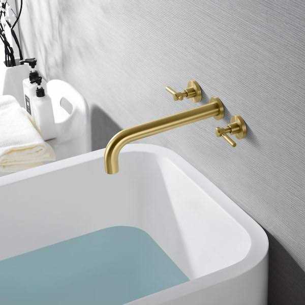 Complete the look of your bath with this SUMERAIN double handles wall mount tub filler Paired with crisp lines and brushed gold finish, it wins praise not only for its presentable looks but also for its lasting durability. Solid brass construction and ceramic disc cartridge provides many years of supreme performance and resists to corrode and leak. 9.71 GPM spout flow rate at 60 psi, this wall mount bathtub faucet can fills up your tub in minutes. 11-11/32 in. extra long spout reach. Two easy turn lever handles controls water and temperature, smoothly and effortlessly.