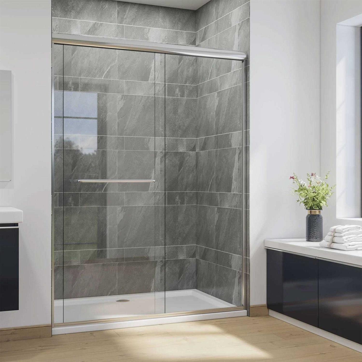 Stepping in and out of the shower can be a messy process if you don’t have the right equipment. This stylish sliding shower door features a contemporary design, providing a clean and enjoyable bathing experience free of needless hassle. The 1/4-inch thick tempered glass offers thorough shatterproof protection, so you can shower comfortably and safely at all times. The double sliding bypass design allows entry and installation to the shower on either the left or right side, for use that matches your preferences. An aluminum door handle equipped with a long bar is mounted proud enough to act as a towel rail or as leverage when opening/exiting. This system includes a long towel bar, 2 sliding glass panels, 4 waterproof seal strips, and all other necessary installation tools. High-quality PVC material seal strips prevent water from leaking to keep your bathroom looking tidy and clean. The shower door features an adjustable width from 52.5 to 54 inches wide and measures 72 inches high.