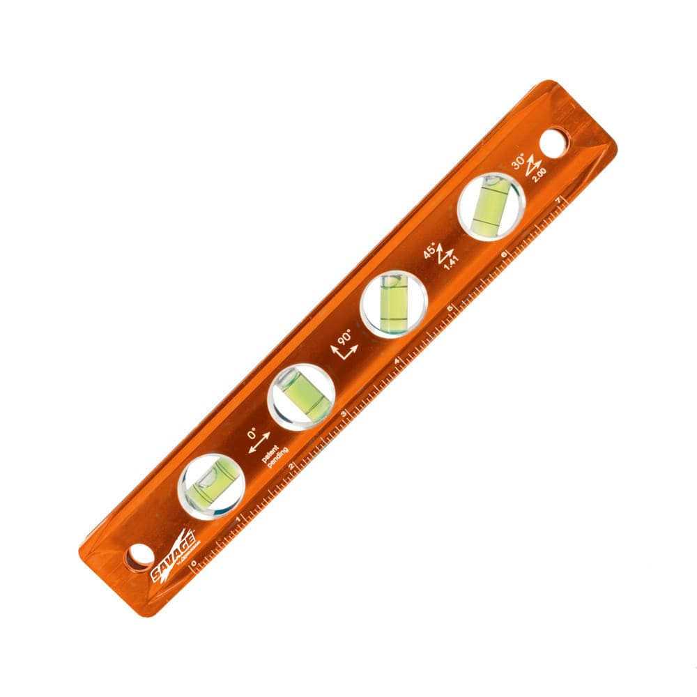 Torpedo level. Designed for every tradesman and carpenter. Billet aluminum frame house 4 leveling vial at 0Âo 90Âo 45Âo and 30Âo. The 30Âo vial is perfect for correctly bending pipes. Exclusive sealed vial caps eliminate vial movement for the life of the tool. Brightview milled vial windows reflect light back into the vials for improved readability. Precision laser etched SAE metric rules and offset scales. V-groove edge accepts round stock and pipe up to 10″ diameter. 4 Neodymium magnets for superior hold. 9″ Length.