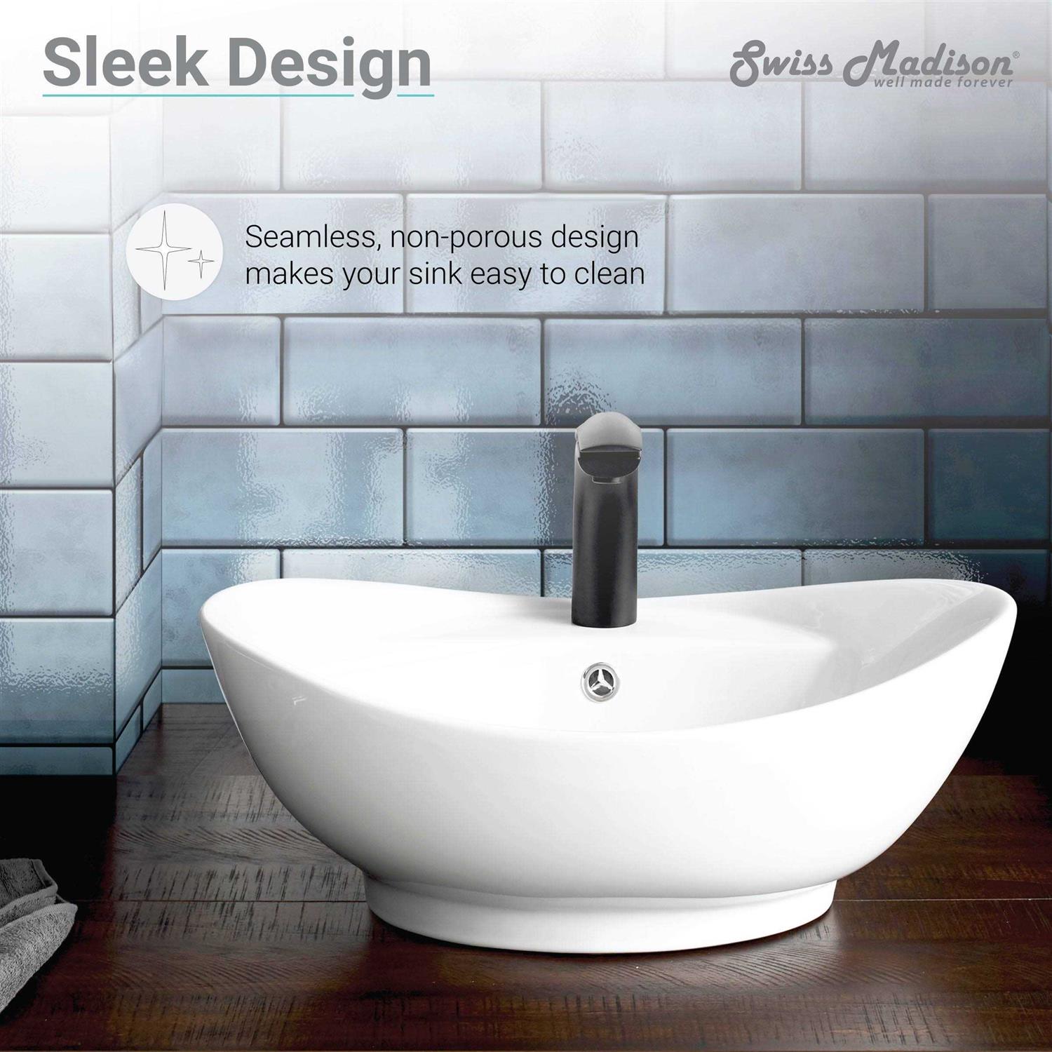 Swiss Madison Elegant and subtle, the Ivy vessel sink features a fresh look for classic white ceramic, in a true minimalist fashion. Striking simple style, while maximizing precious bathroom space, makes above-counter sinks popular for powder rooms. Features smooth baked-on glaze, and non-porous high-gloss finish, for durable scratch-resistant and easy to clean convenience.