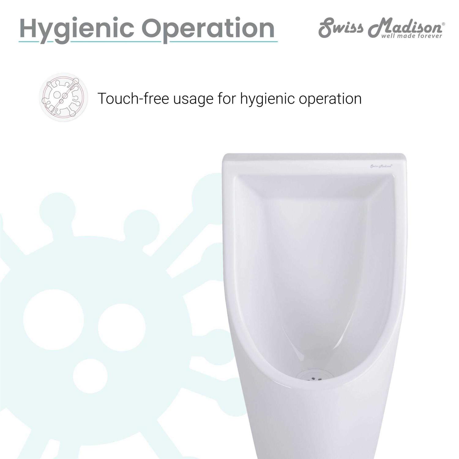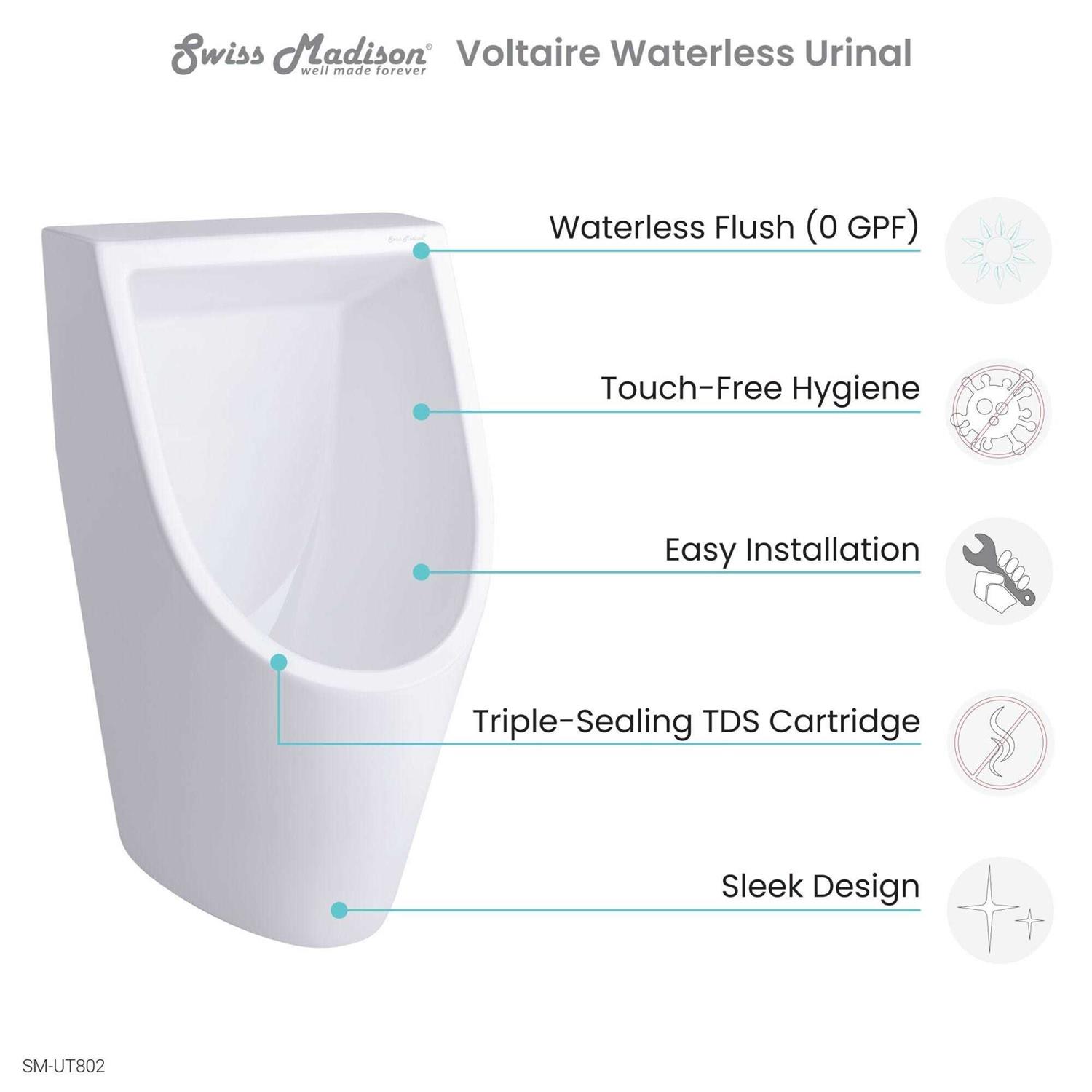 The Voltaire Waterless Urinal by Swiss Madison is a durable ergonomic piece thats perfect for both residential and commercial properties. This environmentally friendly urinal is touch free and odorless making it an ideal hygienic experience and reduces the risk of spreading bacteria. Additionally this urinal was built with total drain and seal technology which is self-sustaining and designed to save on water utility bills. Its also easy to clean with various types of chemicals and soaps.