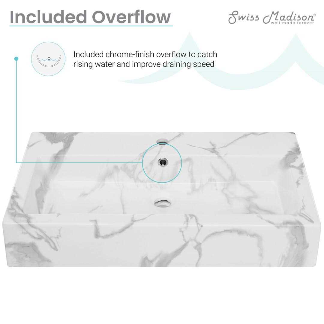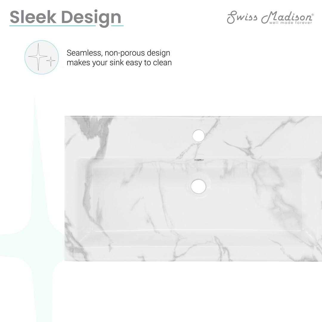 Swiss Madison Voltaire Wide Rectangle Wall Hung Sink in White Marble
