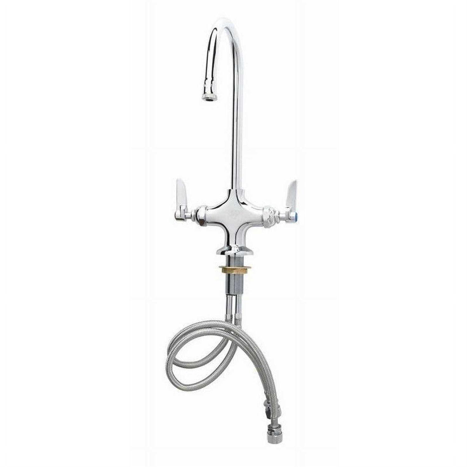 Rigid gooseneck with stream regulator. – Lever handle with color code indexes. – Single hole deck mount mixing faucet with 9.5” rigid gooseneck. – Product Type: Laundry faucet. – Finish: Chrome. – Mount: Single hole. – Faucet Spread: 4″. Country of Manufacture: United States. – Number of Faucet Holes: 1. Handle Included: Yes. – Overall Height – Top to Bottom: 13.69″. Overall Depth – Front to Back: 5.5″. Spout: Yes. – Number of Handles: 2. Spout Height: 8.63″. Commercial OR Residential Certifications: Yes. – Spout Height: 8.63″. Spout Reach: 5.5″. Spout Reach: 5.5″