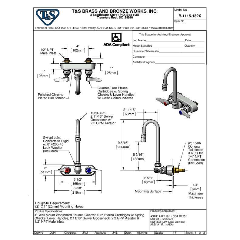T&S Brass B-1115-132X – Faucet Workboard, Wall Mount, 132X