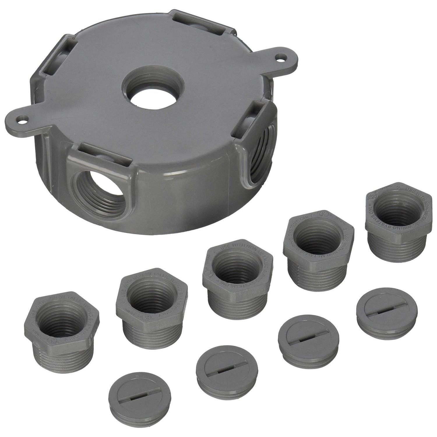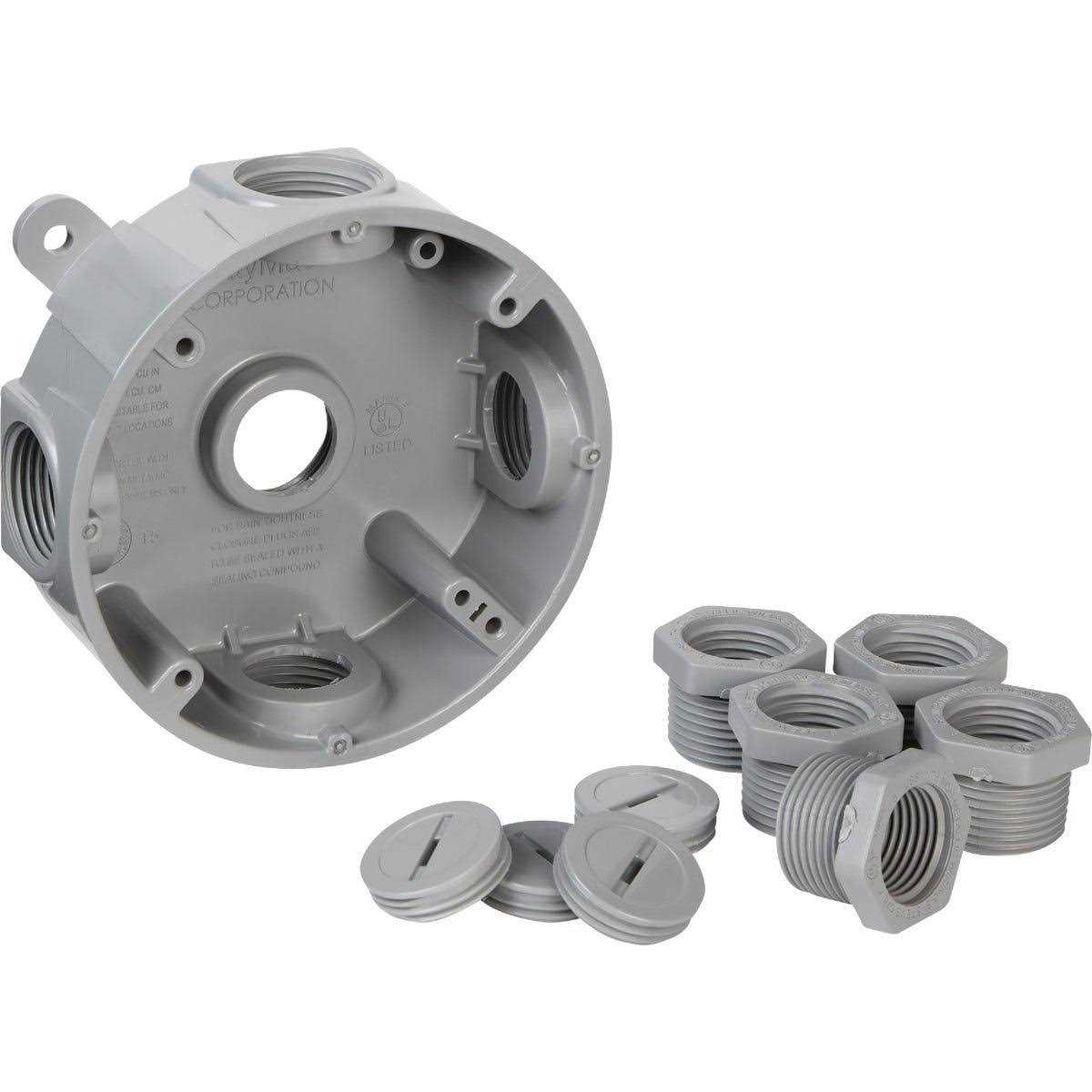Weatherproof Nonmetallic round outlet boxes house receptacles, switches and GFCI’s. Boxes may be used as a weatherproof junction box and accept 1/2 inch and 3/4 inch conduit. The boxes are designed for use in branch circuit wiring in wet, damp, or dry locations.