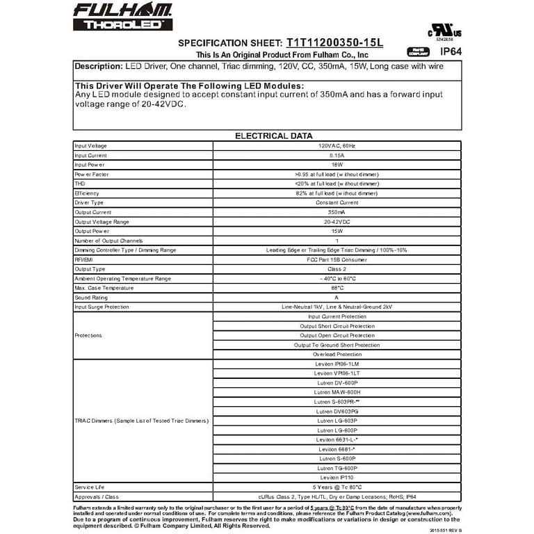 This product is a Fulham T1T11200350-15L ThoroLED LED driver. It has 120 input volts, 20-42 VDC output volts, and 15 watts. Fulham ThoroLED drivers are designed for reliable, high-efficiency performance. A wide range of output currents and case types are available to fit in most common luminaires. Dimmable models feature smooth dimming and compatibility with leading dimmer brands.