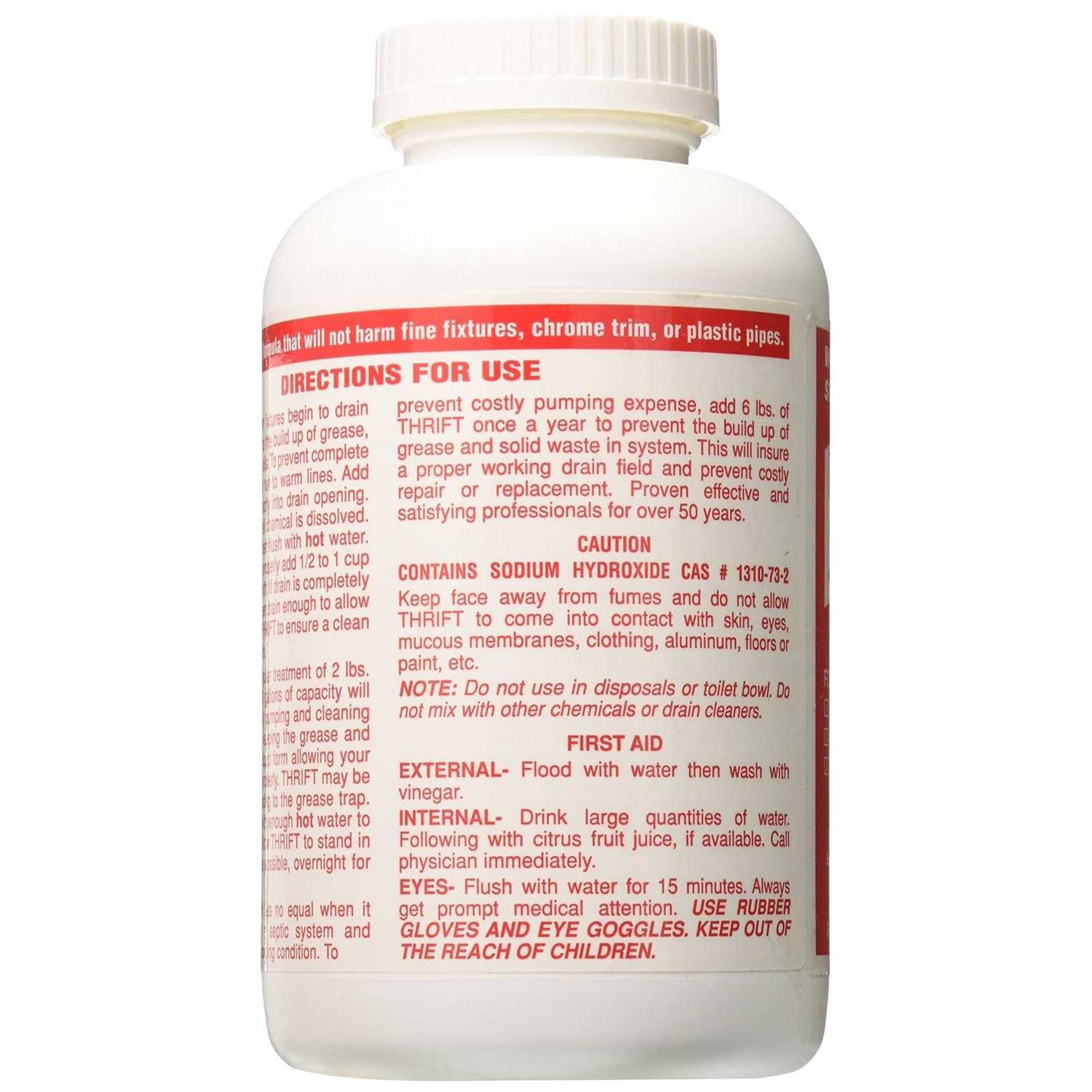 THRIFT CRYSTALS will dissolve Hair, Grease, Soap Scum and most organic gunk in Less than 60 Seconds! Thrift’s Powerful formula is safe for all drain lines and most surfaces and fixtures. THRIFT CRYSTALS can be used in kitchen and bath drain lines, floor drains, grease traps, and Septic systems to keep drain flowing freely.