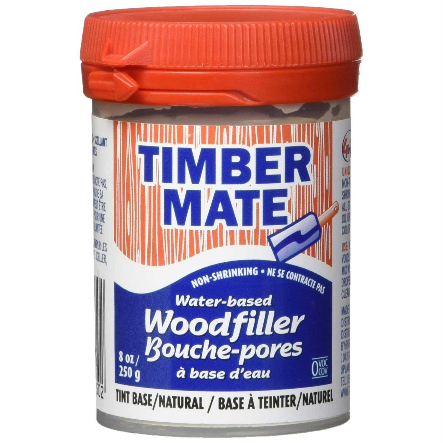 A totally unique quick drying water based grain filler and wood putty accepts stain beautifully or can be tinted. Never goes bad easy to apply and clean up no shrinking, cracking or falling out. Does not become permanent until you apply a finish. If you’re ever unhappy with the way it looks the color just water it down and remove it. If it freezes simply put it in the microwave to warm it up or if it dries out just stir in water. This allows for zero waste this might just be the perfect wood filler. Manufacturer recommends using only stainless steel or plastic tools to apply because timbermate may react with low grade steels and turn black. If this happens simply add water and remove it or wait for it to dry and sand it off. Easy preparation and timbermate is versatile and may be used for all interior repairs including repairing edges.