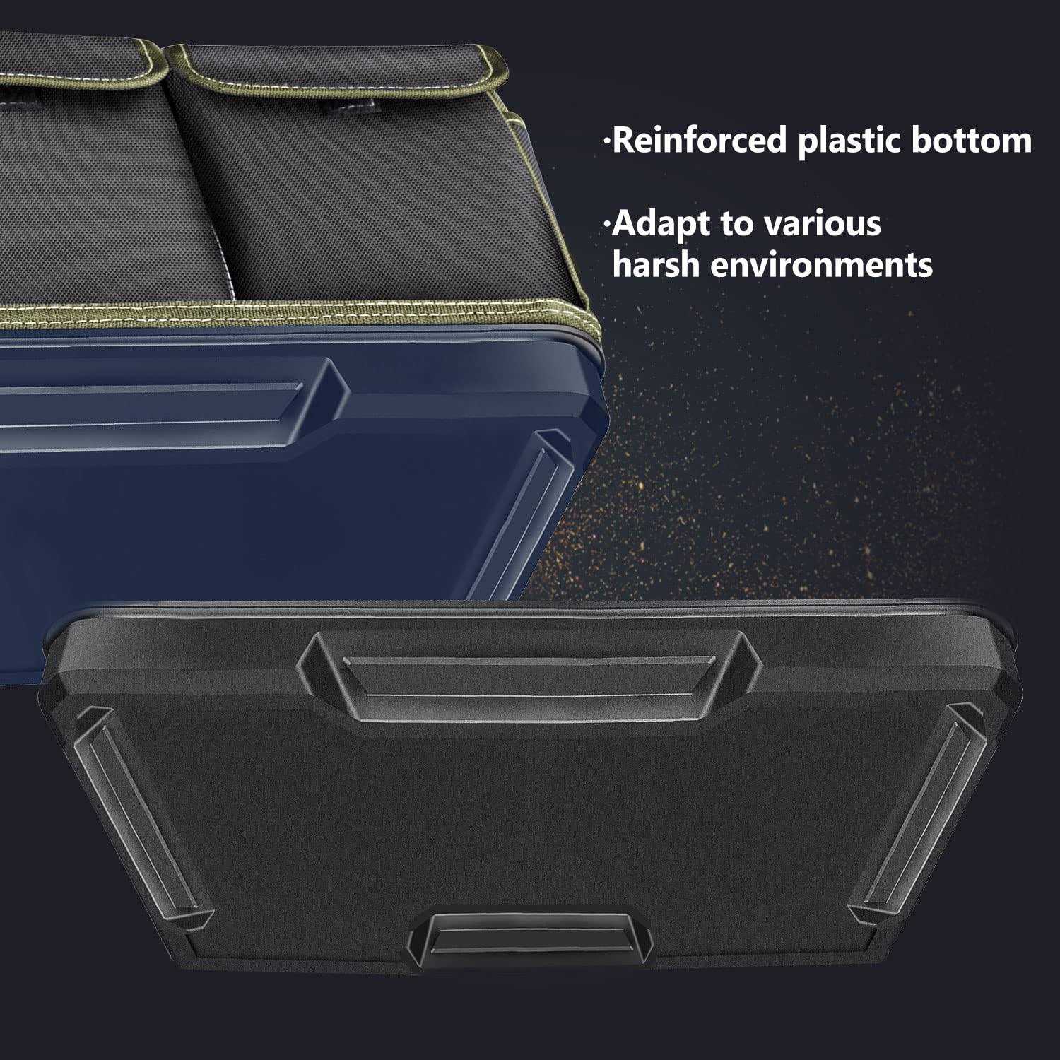 【Sturdy and Durable】- The tool bag is made of high-quality Oxford cloth (five-layer synthesis: Oxford cloth, waterproof layer, PE thick plastic board, waterproof layer, Oxford cloth) and reinforced with a PP plastic waterproof base, providing superior toughness, strength, resistance to dirt, and long-lasting durability, making it suitable for use in various harsh working environments. 【16 Pockets and Large Capacity】- The tool bag has 8 pockets on the inside and 8 pockets on the outside. These pockets can be used to sort and hold small tools, making them neat and easy to access. With a capacity of 17 inches, it can accommodate most daily tools for storage. 【High Quality】- The perfect structural design, waterproof Oxford cloth and waterproof base ensure the cleanliness and dryness inside the tool bag. The sturdy base is suitable for harsh environments such as sand and stones. It can prevent tools from being damaged, as well as preventing them from rusting or getting wet. 【Easy to Carry】- The tool bag comes with a shoulder strap and a soft padded handle, suitable for use in different work environments, easy to carry, and can effectively relieve hand fatigue and shoulder pressure. 【Wide Use】- The tool bag is designed to store various tools and is suitable for electricians, plumbers, carpenters, and household essentials. The tool bag has a sophisticated design and perfect quality, suitable for various harsh environments, including wind, rain, heavy snow, intense sunlight, and construction sites.