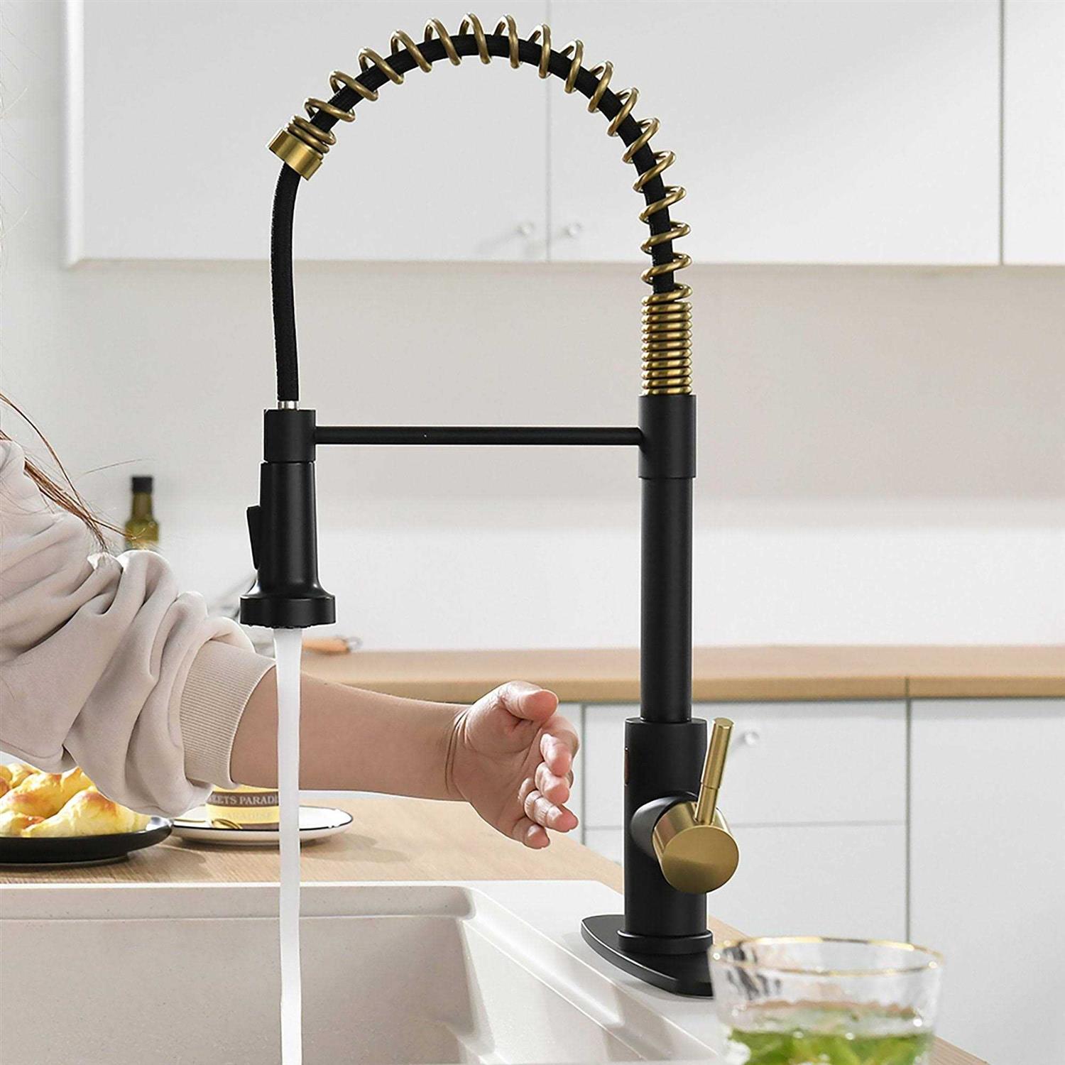 This is a powerful yet aesthetically pleasing kitchen faucet that supports touchless operation. Delivers impressive performance with a touchless flow sensor for a more convenient and hygienic experience. The pull-out spray head switches from aerated flow to spray at the touch of a button for powerful cleaning. The stowable design protects the pull-out hose. The premium stainless material is durable and effortless to install. Features Superior Finish: Multiple-layer protection matte black and stainless material resists rust, corrosion and tarnishing. To keep the faucet clean and always new, just wipe it with a soft cloth. Multifunctional Pull Out Sprayer: Touch-less kitchen faucet with 2-way spray setting(STREAM, SPRAY), stream for filling water, spray for rinsing. The pull-out spray head switches from aerated flow to spray at the touch of a button for powerful cleaning. Keep the Faucet Clean: Whether you have two full hands or 10 messy fingers, you can choose to use a clean wrist or forearm close to the sensor mechanism at the bottom of the pipe instead of manually using the single lever handle to avoid getting your hands dirty. Easy to operate: Your single-handle kitchen faucet with a pull-out sprayer spout equipped with an ergonomic 360-degree rotation pull-out nozzle, provides you with a more convenient user experience. All accessories are cupc-certified to protect your health. Battery: Requires battery or solenoid valve(Supplied with control valve and battery box). Options: BLACK and BRUSHED BLACK and GOLD BRUSHED GOLD
