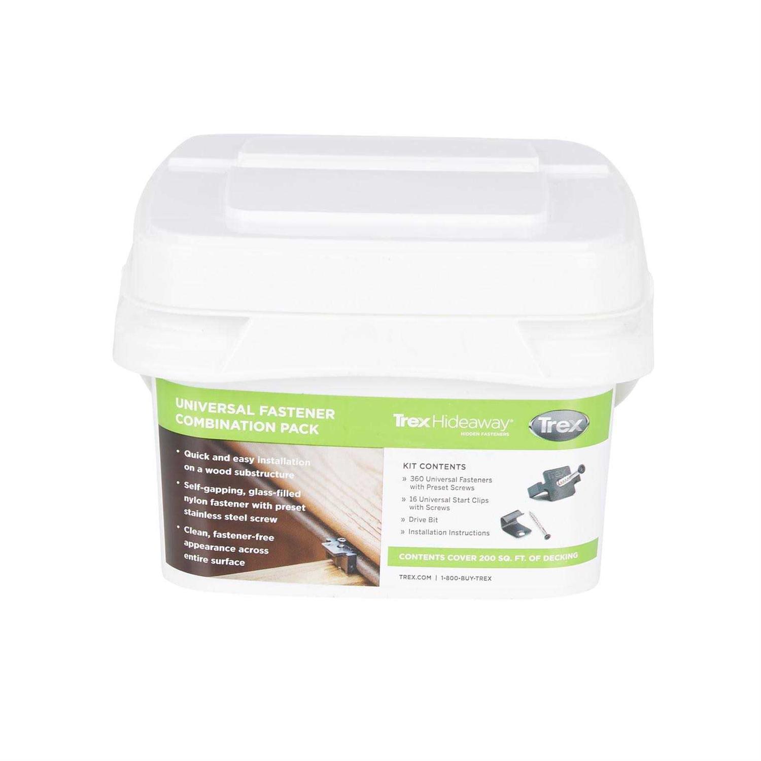 Create a smooth, screw-free finish and perfectly space Trex deck boards with this hidden fasteners combo kit. Use between each grooved-edge board for perfectly consistent spacing and no visible surface screws on up to 200 sq. ft. of decking. Kit includes 360 self-gapping, glass-filled nylon, universal deck fasteners with preset stainless steel screws, 16 universal start clips with screws, drive bit and installation instructions. Color Black.