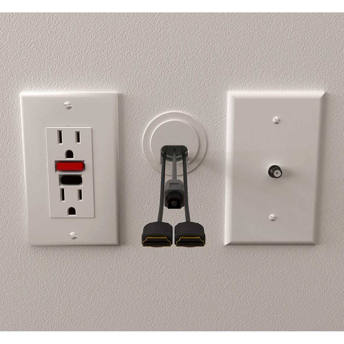 This self-locking wire and cable management grommet is great for use in walls, ceilings, floors, computer workstation desk tops, entertainment centers and endless other applications. Installation: A unique and better grommet to do the job right. Once surface opening made, no tools used. Wires/cables can be passed through grommet before or after installation. Grommet wings are retracted and then activated for insertion into surface and securing/locking into position by simply turning the pass through tube. Once wires/cables in position, place finishing cap on tube. Grommet is reusable for future relocations. Length: 1 1/2?, Width of outer surface rim: 2 3/4?, Wire/Cable pass through inner diameter: 1 1/2?, Mounting surface thickness: 3/8? 1?, Hole saw bit size: 2 3/8? or use any sheetrock type hand saw- Patented