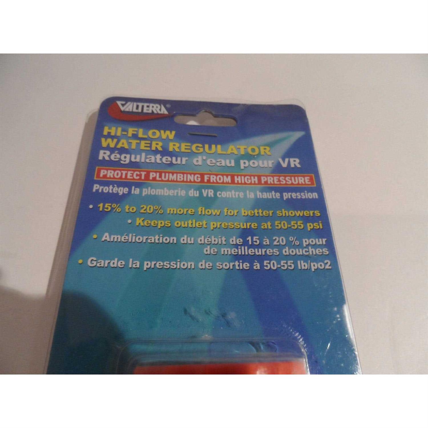 Water Hoses & Fittings by Valterra. Details:Description Regulate your RV’s water pressure with the Valterra Lead-Free Hi-Flow Brass Water Regulator! The adapter regulates incoming water pressure to 50-55 psi, the ideal pressure for your needs. The screened washer prevents debris from running through your camper water system and is easy to clean. The water regulator attaches to the campground water spigot and reduces the water pressure that feeds through the water hose into the RV. It protects both the hose and the RV from high pressure and prevents pipes from bursting. With a lead-free brass construction, you can be confident in the safety and quality of your attachment. The Valterra Brass Water Regulator conforms with federal and state laws for drinking water fixtures, making it the ideal addition to your RV. Water pressure over 55 psi is not recommended.