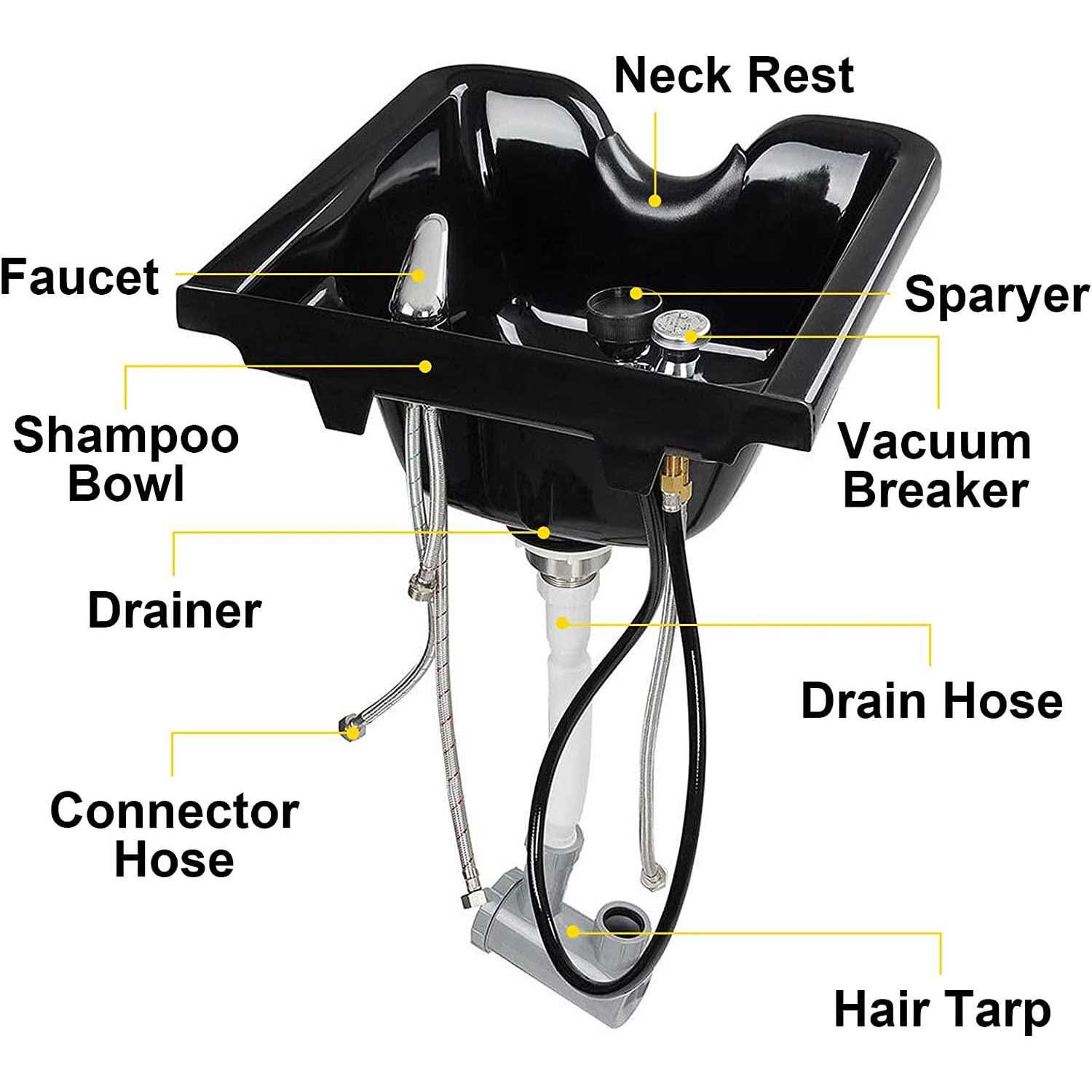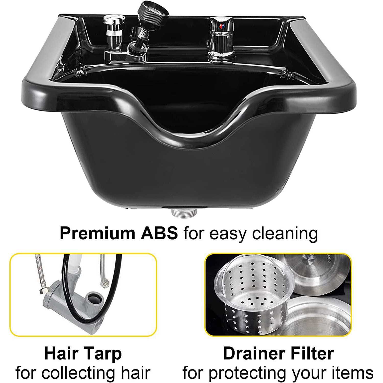 Brand Introduction VEVORbrand is a leading brand that specializes in equipment and tools. Today, VEVORbrand has occupied markets of more than 200 countries with 10 million plus global members. Why Choose VEVORbrand? 1. Tough Quality Assurance 2. Incredibly Low Prices 3. It is made from high-impact ABS Plastic with a high gloss finish making each bowl functional, visually appealing, and providing long lasting durability and service. Durable Plastic Material Made of high-impact ABS plastic with a high-gloss finish, this bowl is scratch-resistant and highly resilient for long-term use. Large-capacity Square Design Designed with classic square style, this advanced shampoo bowl boasts enough capacity designed for your convenient life. Cold & Hot Water Supply Inlets Equipped with hot and cold faucet, you adjust the water temperature to fit your need. Easy-Clean Hair Trap A professional grade hair trap helping to protect against loss of jewelry, contact lenses, or other valuables that can be accidentally washed down the drain. Easy To Install All the accessories for installation, vacuum breaker, faucet, shower hose, white drain hose, drain hair basket and plastic bowl are all included. Specifications