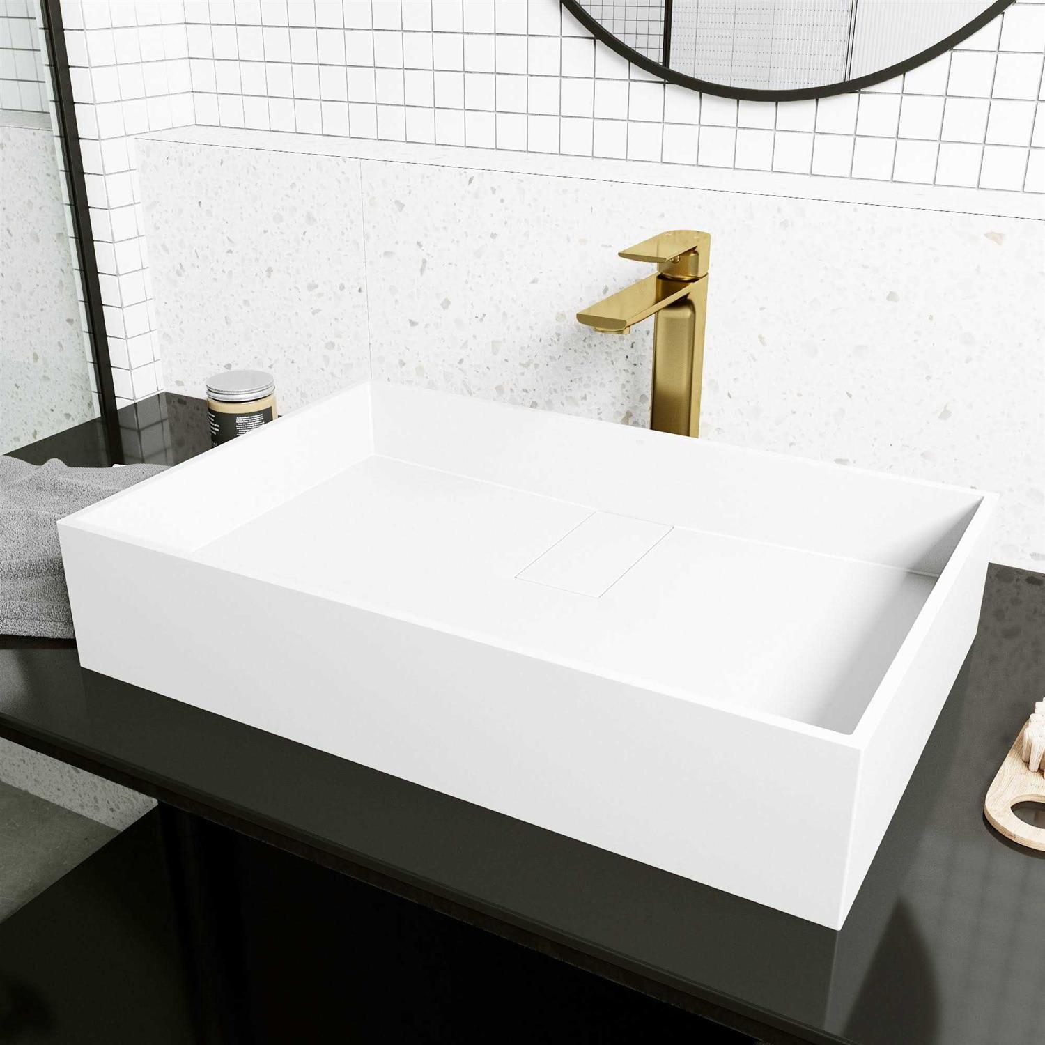 A rectangular design shape and exclusive stone material distinguish The Montauk by VIGO. Constructed from VIGO’s exclusive Matte Stone material, this vessel bathroom sink is solid-to-the-core, more robust and more durable than conventional vessel sink materials like fireclay or ceramic that chip and crack. Its unique stone material delivers a clean white color and a smooth to the touch surface. Its drain plate elegantly hides the drain and provides a flawless cleaning experience. The Montauk matches innovation with style to create a highly functional art fixture for your bathroom.