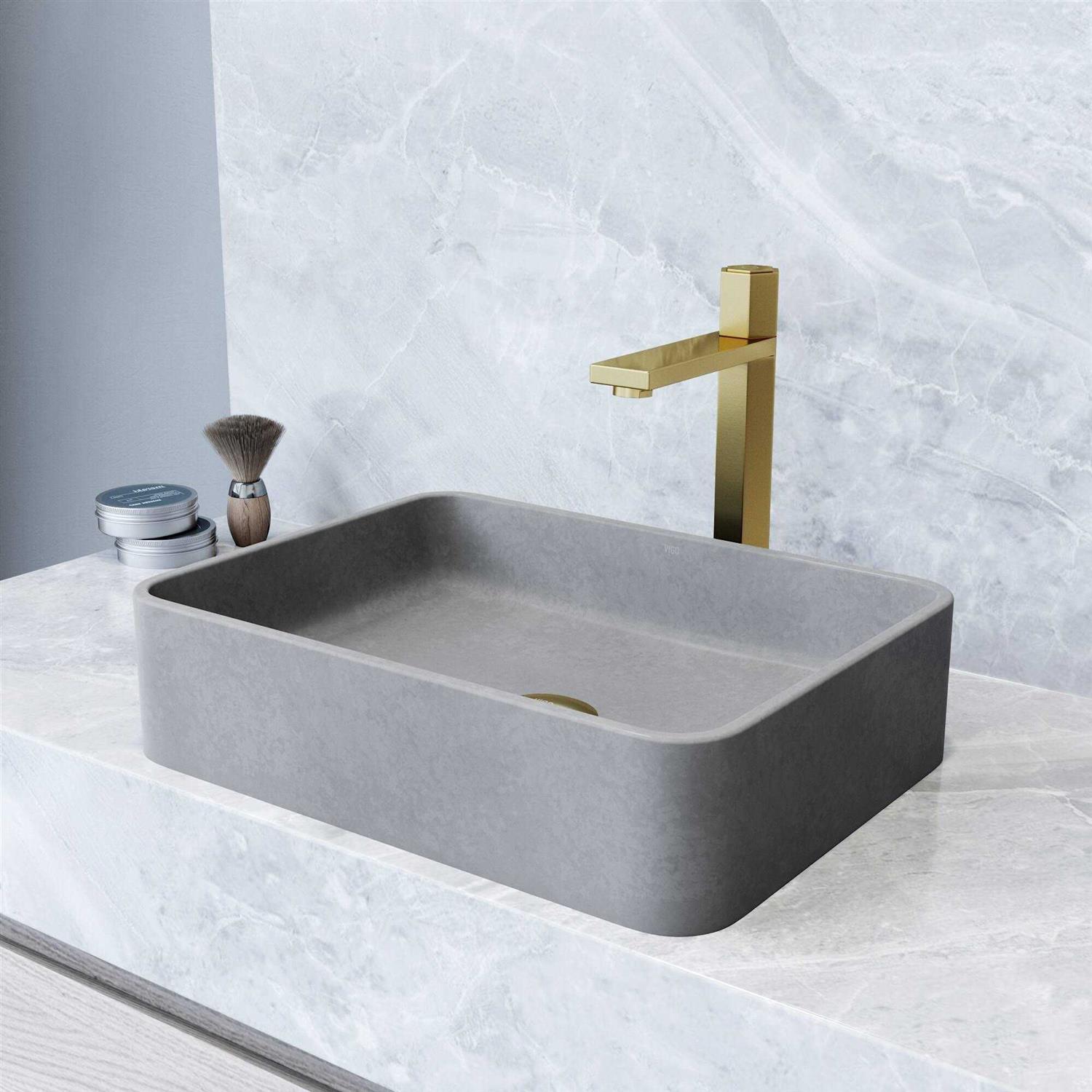 VIGO Vigo presents an elevated bathroom vessel sink handcrafted from Concrete Stone, a mixture of concrete and naturally sustainable materials, this sink is more durable and longer-lasting than traditional sink materials. Its neutral grey colour and gentle corners complement any bathroom vessel faucet, wall-mount faucet, and countertop. The Concrete Stone Collection is ideal for traditional, transitional, and modern bathrooms.