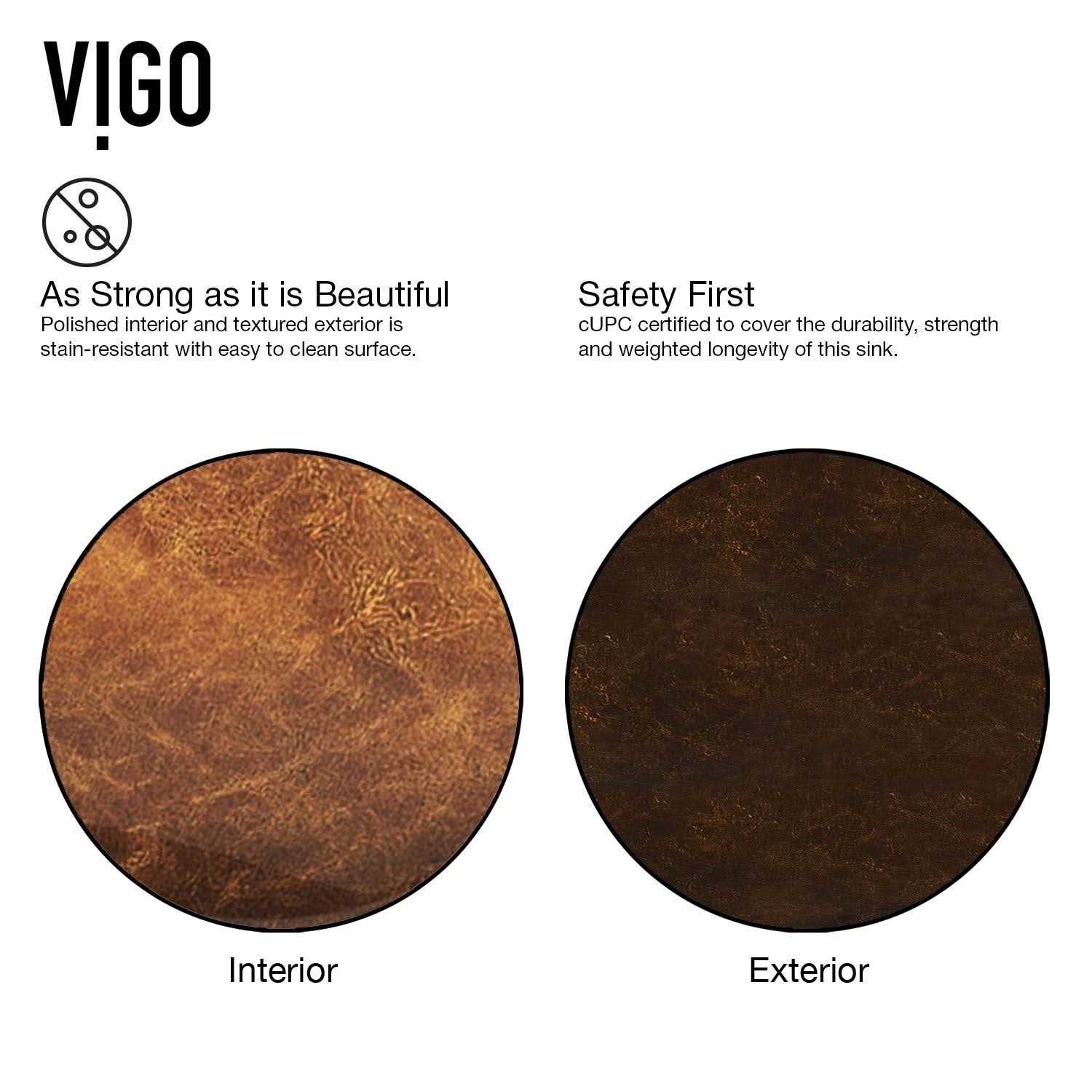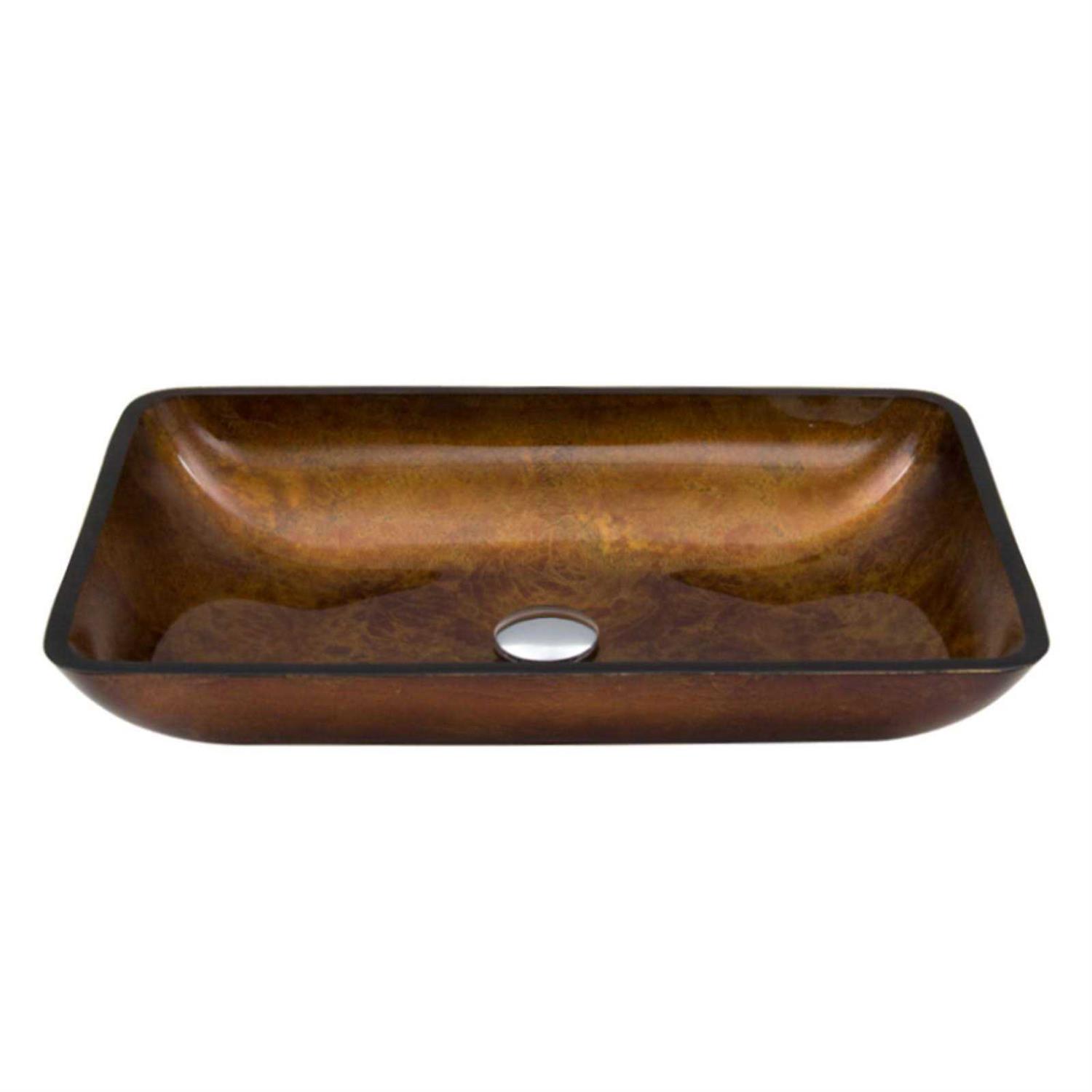 Solid tempered glass construction makes the handmade VIGO Rectangular Russet Glass Vessel Bathroom Sink ideal for everyday use. Its stately size makes this sink a modern statement piece in any bathroom. The polished interior and textured exterior are stain-resistant and easy to clean. Mahogany and amber tones with subtle red accents create a pretty sheen to invoke earthy undertones, making this the perfect centerpiece for your bathroom. Highlights: – 14.5 in. L x 22.5 in. W x 4.5 in. H – Polished interior and textured exterior for easy cleaning – Tempered glass construction for safe, scratch-resistant use