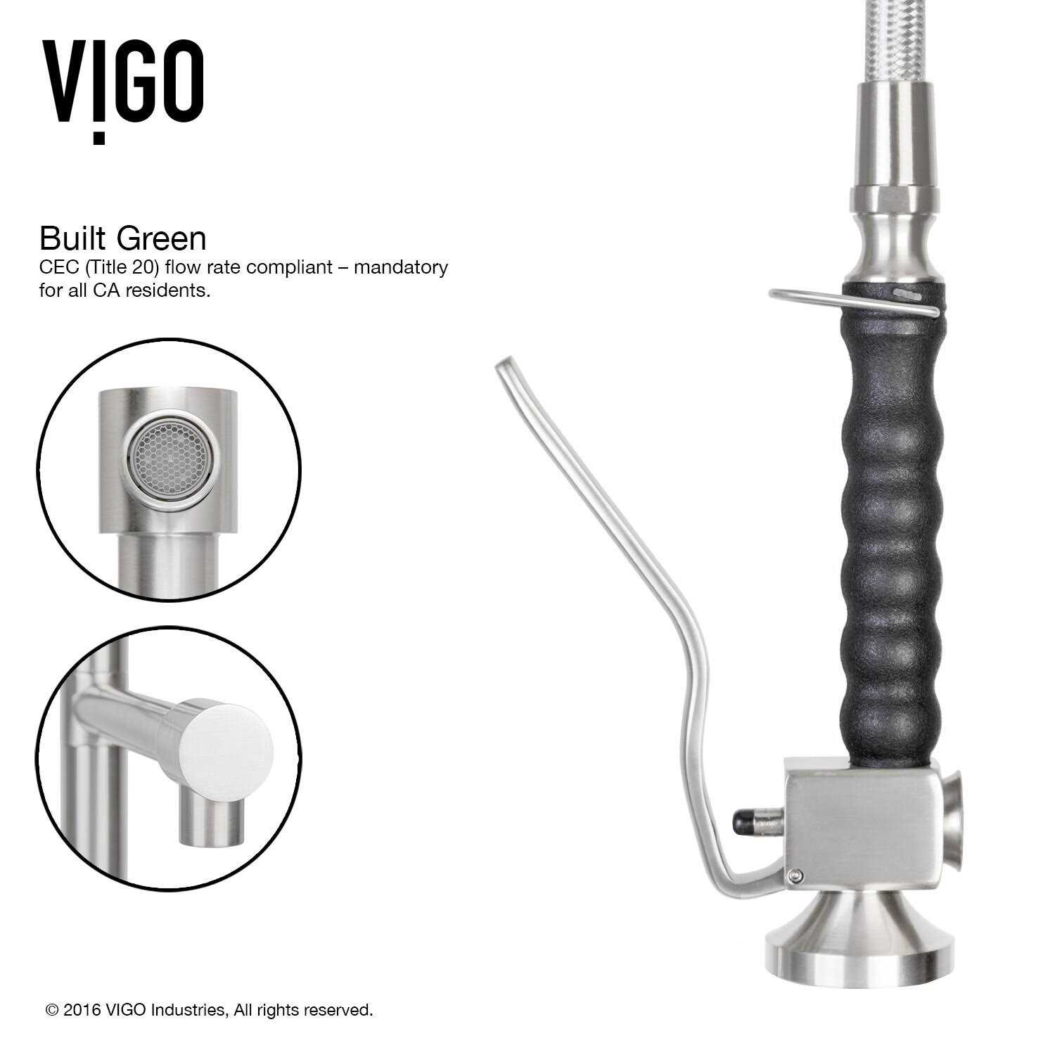 This Vigo Pull-Out Spray Kitchen Faucet will accent your kitchen by adding a stylish yet durable look to your space. The solid brass construction ensures a longer life. The faucet features a spiral pull-down spray head for a powerful stream and separate spout for aerated flow. It has a 360 degree swivel giving you plenty of range to clean your dishes effectively. The Vigo kitchen faucet is available in multiple finishes so you will be able to choose a look that goes nicely with the fixtures in your home. It comes with all necessary mounting hardware and hot/cold waterlines included so you can install it right away. The Vigo faucet has a high-quality ceramic disc cartridge that ensures maintenance-free usability. It will also resist corrosion and tarnishing to keep it looking new. The Vigo Pull-Out Spray Kitchen Faucet will give your space the updated look you want.