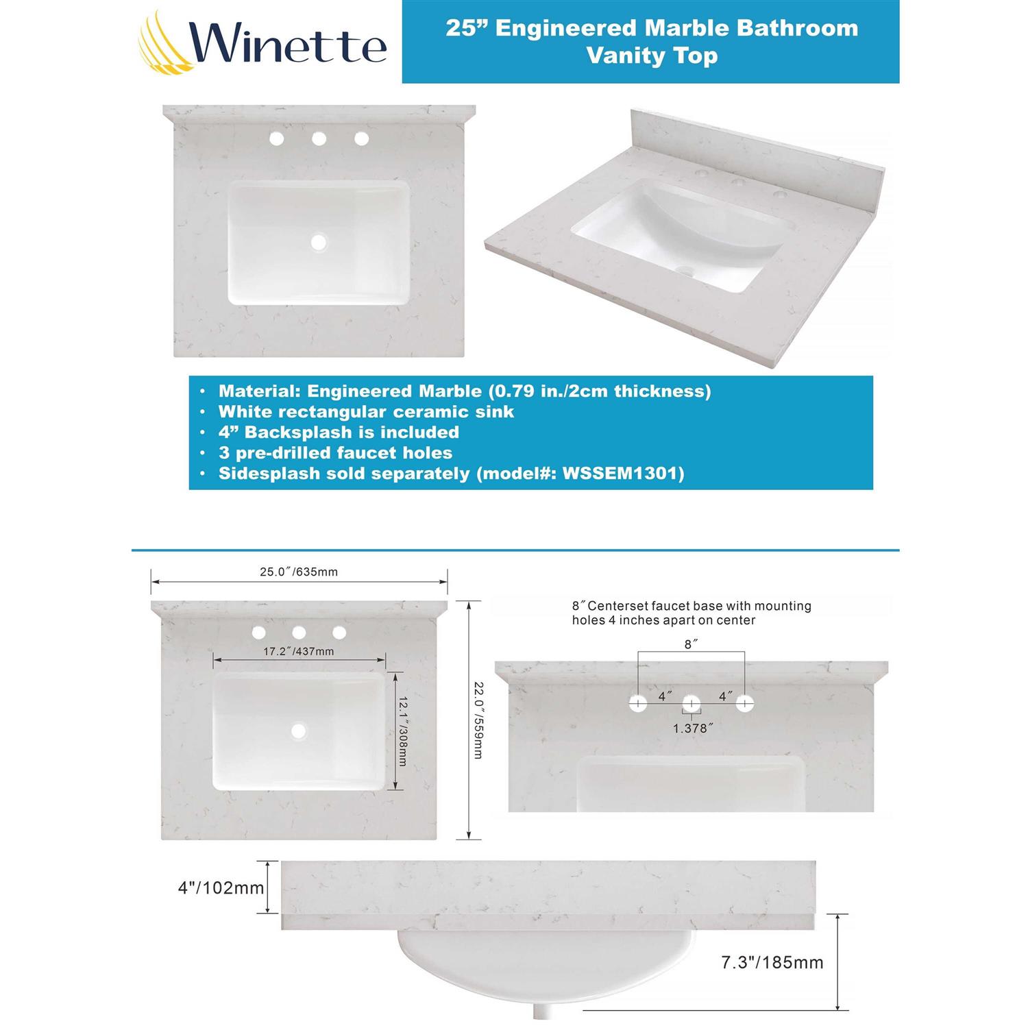 Renovate your bathroom with our elegant bathroom vanity top with attached under-mount vitreous China sink. Ideal for quick and easy installation. This engineered marble top is easy to install and fits directly on top of your vanity cabinet. Included is a 4 in. backsplash to protect your walls from water splashes. Includes pre-drilled faucet holes for easy of facet installation. Stylish look and color to deliver a balance of beauty and purpose for your home.