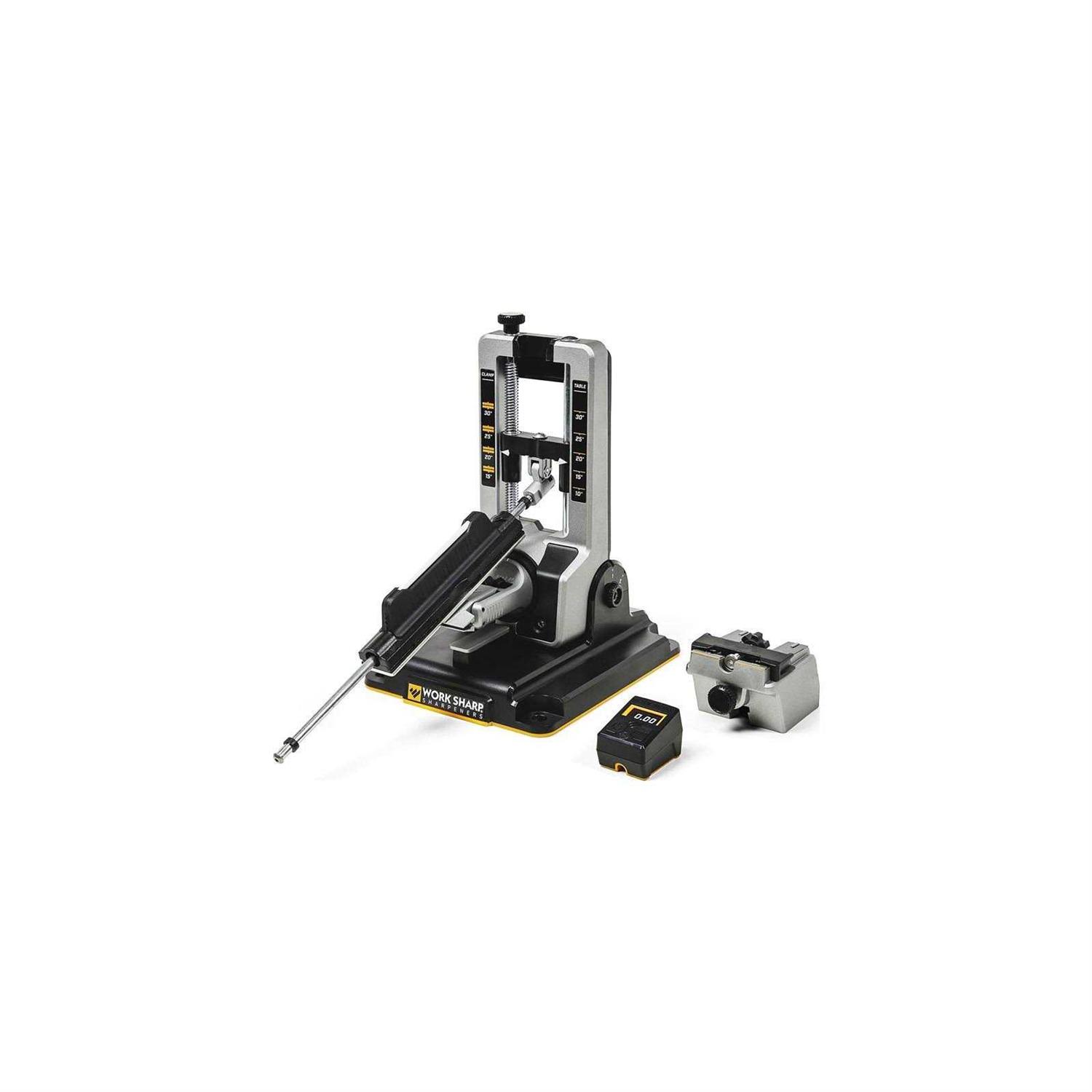 The Work Sharp Professional Precision Adjust is a complete angle adjustable knife sharpening system using metal construction, a digital angle indicator, and seven abrasive grits to bring rigidity, repeatability, and precision to your knife sharpening needs. The sharpening angle easily adjusts from 15 to 30 using a digital angle indicator to accurately and repeatably set your sharpening angle. The seven individual abrasives all measure 1 x 6 and include: 220, 320, 400, 600, and 800 grit diamond plates to quickly sharpen your edge, a ceramic plate that hones to an incredibly keen edge on any knife, and a leather strop that refines and polishes your knife to a scary sharp edge. The abrasives are easily interchanged using a common handle for repeatability. The ceramic rod on the abrasive handle hones serrations back to sharp as new condition. The innovative V-Block ClampTM quickly, securely, & repeatably secures your knife. The included base provides a safe and stable platform that tilts back to allow rotating an 8 knife without removing the knife or clamp. The included small knife table attachment allows you to sharpen small pen knives down to a 15 angle.