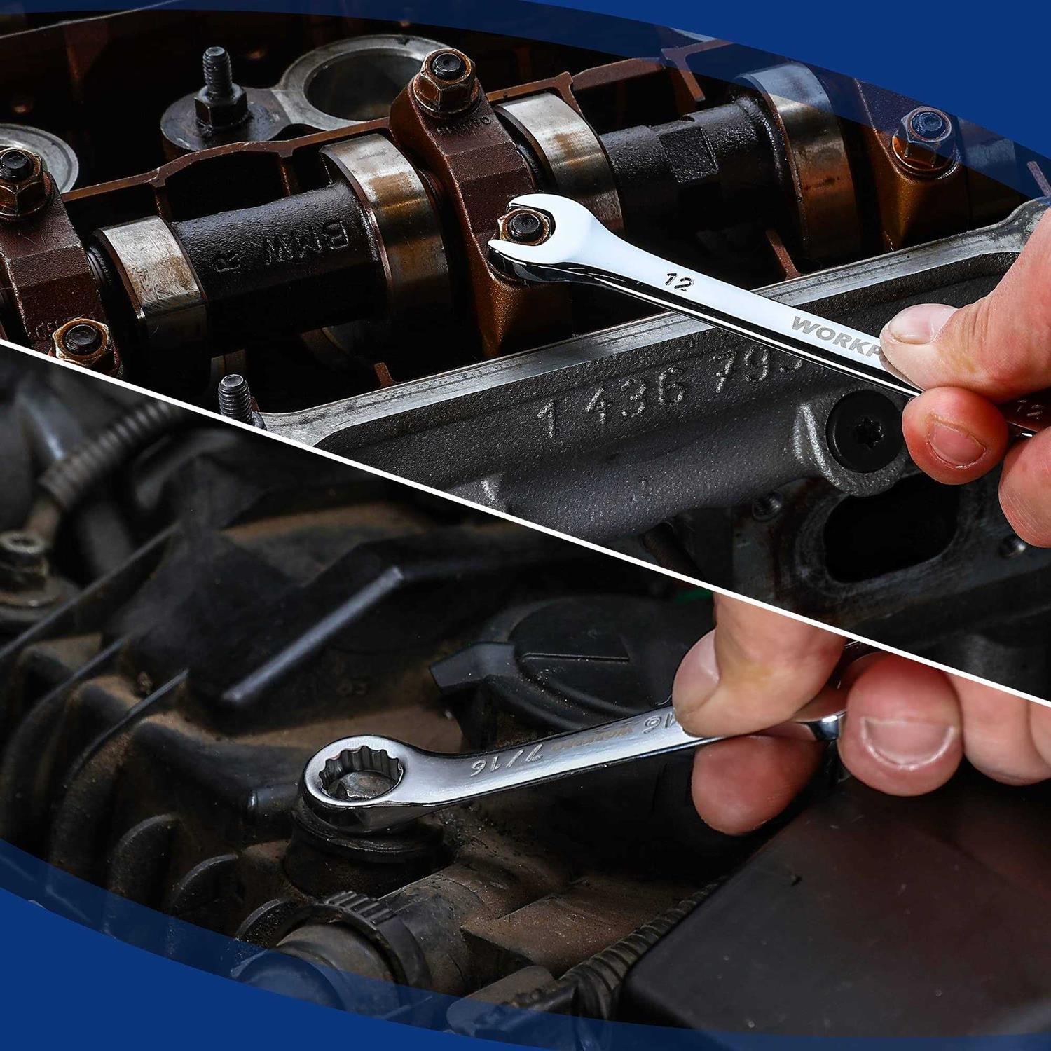EFFICIENT WRENCH: This combination wrenches are set up with 12-point box end, doubles the access angle than a 6-point, box end opening is designed to grip flat sides of fastener heads not corners to prevent round-off. STURDY & DURABLE: This gear wrench set is forged from high-quality chrome vanadium steel. The surface is electroplated with bright chrome and mirror polished to prevent corrosion and oxidation, which extends the service life. The wrench hardness up to HRC 50 makes the wrench able to bear more force. A wide variety of tools for the best possible results. HANDY CARRYING BOX: The combo wrenches set comes with a premium organization tray for easy carry and hang, minimal packaging helps wrenches stay organized and allow quick access without the bulk and can fit into most tool drawers. COMPREHENSIVE APPLICATION: WORKPRO combination wrench sets have a wide range of application scenarios, including motorcycle repair, auto repair, home projects, bicycle repair, machinery repairs, garage engineering, and so on.
